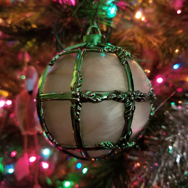 I remember being fascinated by these as a child. My parents had them in the round balls like the one above, teardrops, and bells. By the time they had given me what was left of the set when I was in my 20s, there were only three or four left, and the paint worn off or degraded to the point where the plastic underneath was brown and starting to crumble. Not sure how this one survived, but I’m glad I have it. (And yes, that is a flamingo photobombing in the background on the left, heh.)