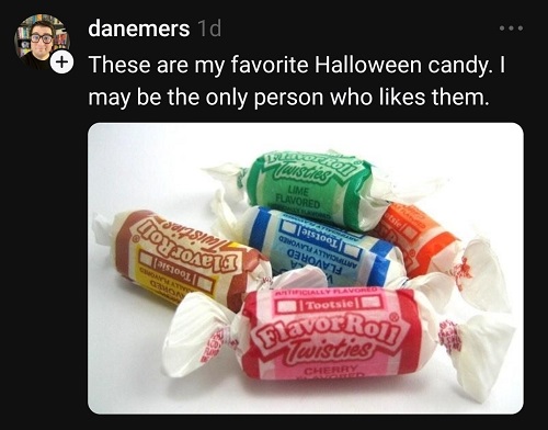 Me, I loved the vanilla ones (blue wrapper) and banana ones (yellow wrapper), but as I read the comments on Dan’s Thread, I saw that the vanilla ones are akin to pineapple on pizza: you either dig it or you don’t. It would seem that these candies overall are polarizing because he said when he posted this on X people were all “ew, that’s gross,” but on Threads it’s “all love.”