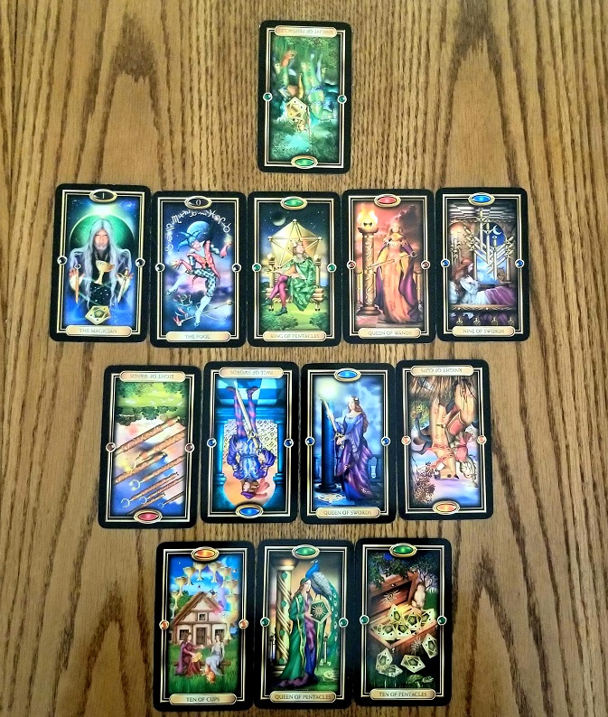 Today I did my yearly birthday Tarot spread. This year I based it on Biddy Tarot’s Birthday Spread, but I added a card for myself as the querent at the top.