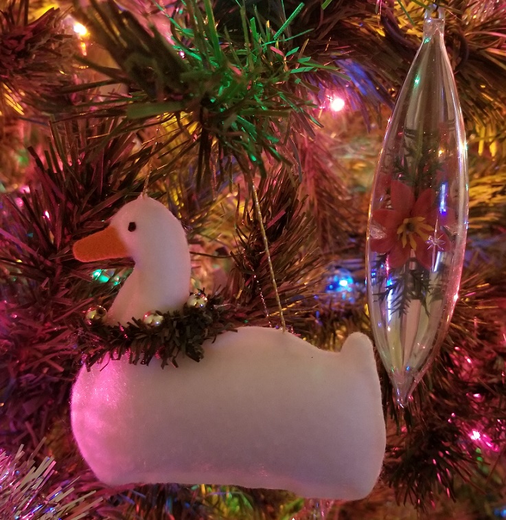 Here’s my Big Duck Christmas ornament, along with one of the ornaments from a set that used to be my parents’. I lived on Long Island for most of my 40s and got the Big Duck ornament when a friend came up to visit me and we went wine tasting.