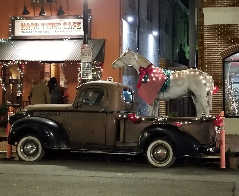 The Hard Times Horse is an unofficial landmark in Old Town. The story goes that Fred Parker, the fellow who opened the restaurant back in 1980, saw the horse in a tack shop in rural Virginia. The horse modeled saddles, but the tack shop was getting rid of it, so he bought it and put it in the back of his antique truck. He and his sons drove the truck around to different events in the D.C. area. Parker died in 2020, but his sons still drive it in parades. It’s a great story, and I’m glad I found an article about it because I’ve been wondering about it for years.